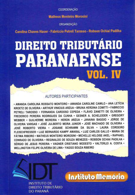 |  | Morosini, Matheus Monteiro (coord.); Hauer, Carolina Chaves; Tarosso, Fabriccio Petreli; Padilha, Robson Ochiai (org.). Direito tributário paranaense . Curitiba: Juruá. 2024. v. 4. 493 p. |