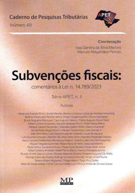 |  | Martins, Ives Gandra da Silva; Peixoto, Marcelo Magalhães (coord.). Subvenções fiscais : comentários à Lei n. 14.789/2023. São Paulo: MP Editora. 2024. v. 4. 591 p. |