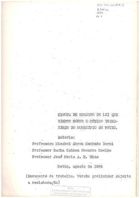 |  | Betim. Derzi, Misabel Abreu Machado. Coêlho, Sacha Calmon Navarro. Dias, José Maria A. M.. Minuta do projeto de lei que dispoe sobre o Código Tributário do Município de Betim . Betim: [s.n.], 1984. 77 p + 46 p. |