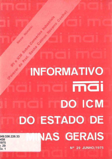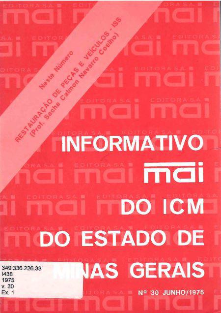 |  | Coêlho, Sacha Calmon Navarro. Informativo MAI do ICM do Estado de Minas Gerais . Belo Horizonte: Mai Editora S.A., 1975. v. 30. 44 p. |