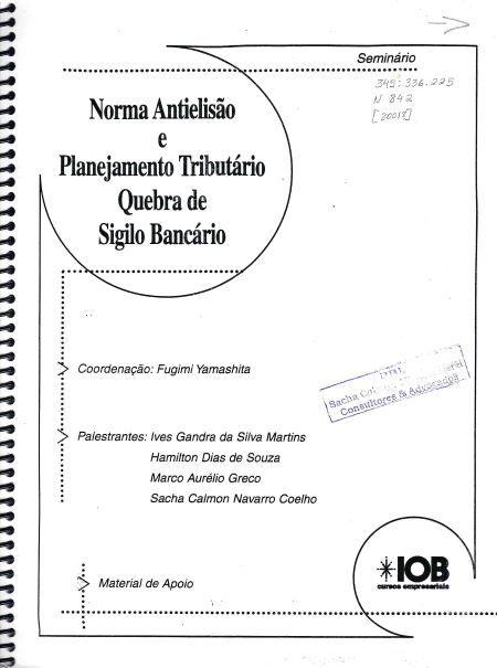 |  | Martins, Ives Gandra da Silva. Souza, Hamilton Dias de. Greco, Marco Aurélio. Coêlho, Sacha Calmon Navarro. Yamashita, Fugimi (coord.). Norma antielisão e planejamento tributário : quebra de sigilo bancário. São Paulo: IOB. [2001?]. 1 v. |