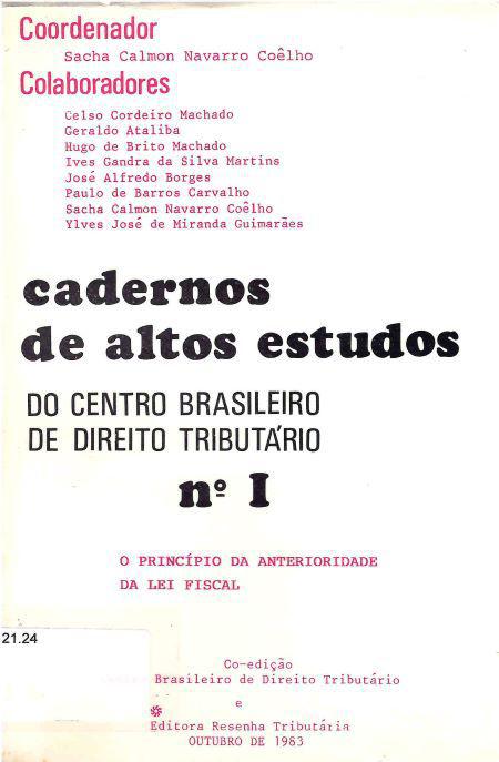 |  | Caderno de Altos Estudos do Centro Brasileiro de Direito Tributário : o princípio da anterioridade da lei fiscal. São Paulo: Editora Resenha Tributária, 1983. 282 p. |